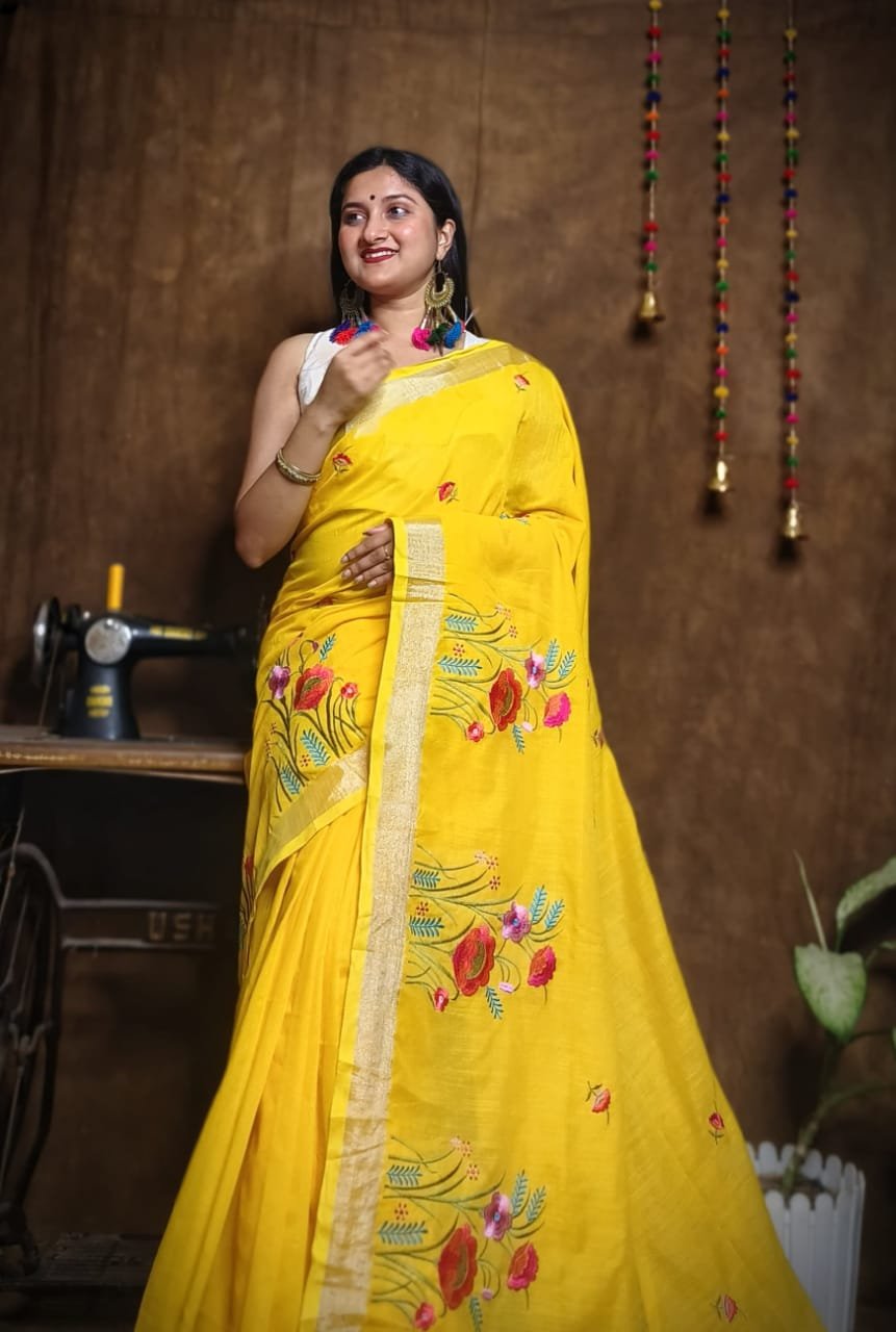 New Lotus Bright Gold Embroidery Work Cotton Sari