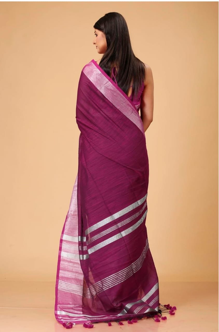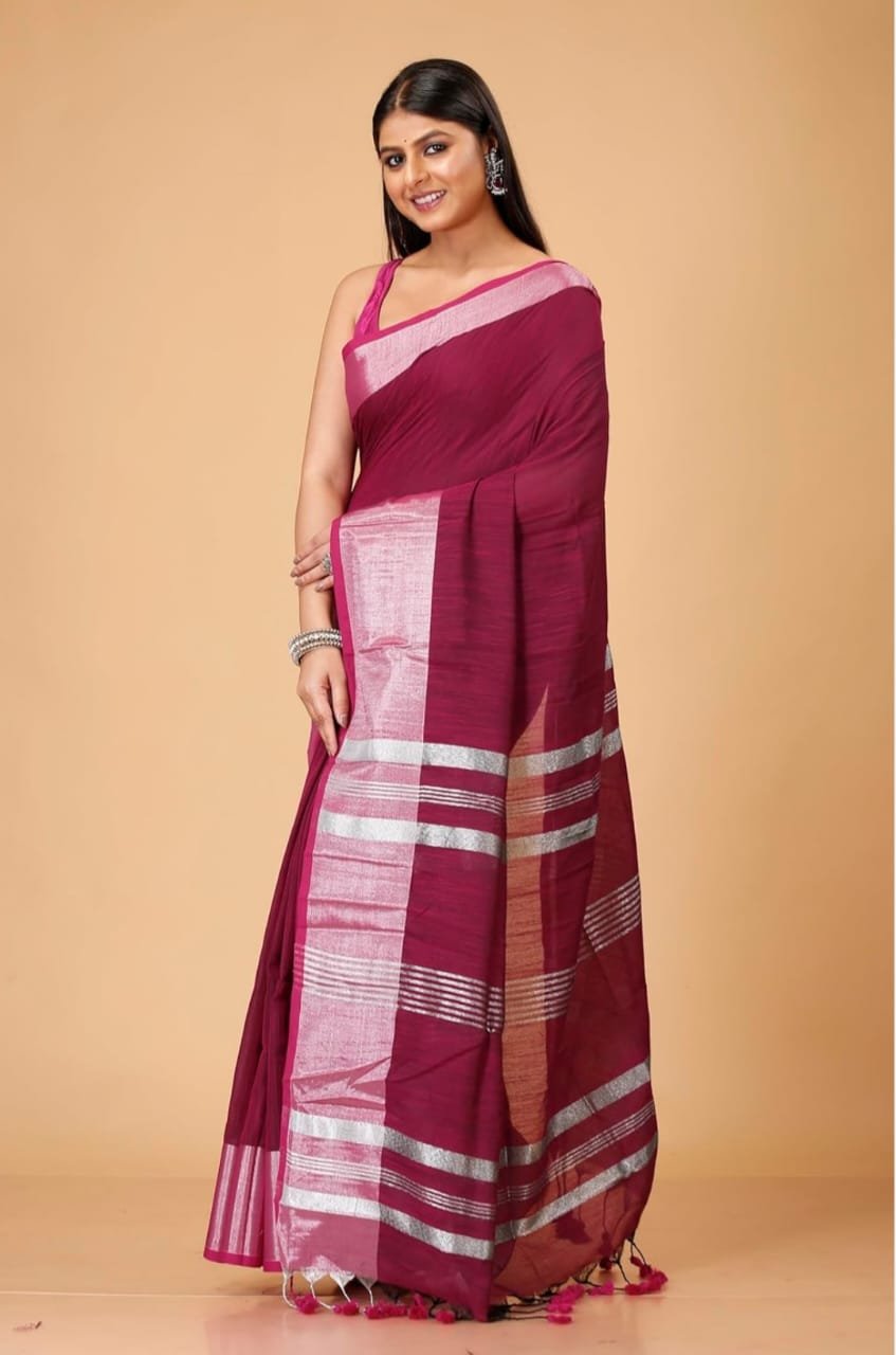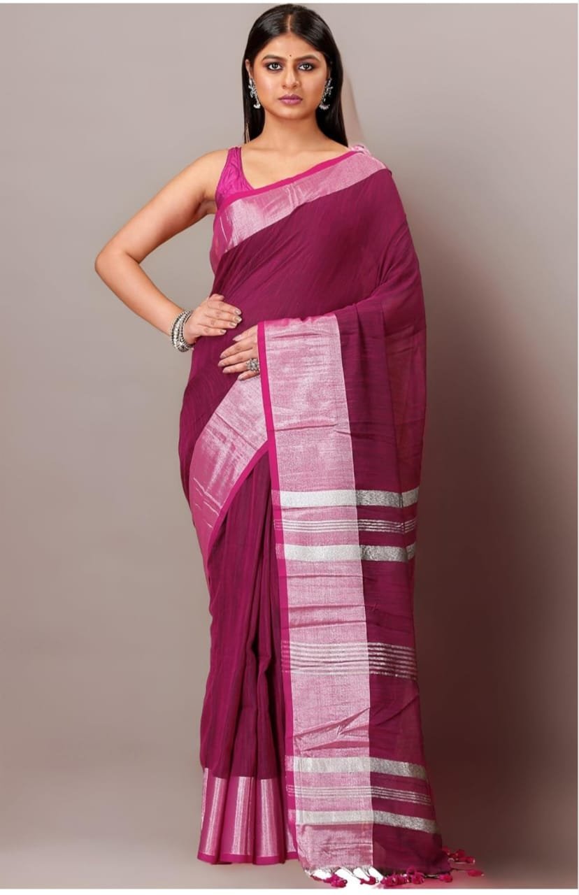 Handloom Wine Berry Soft Slub Cotton Sari With Blouse Piece