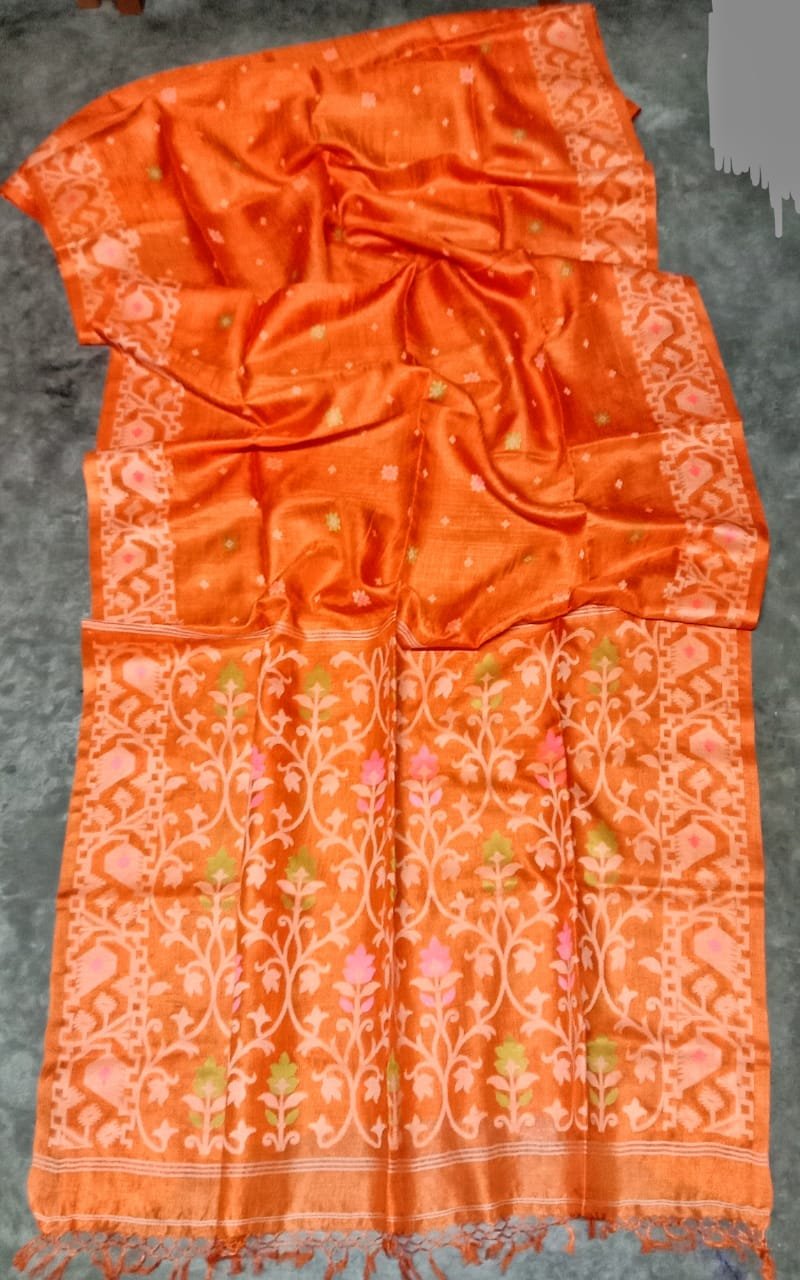 Deep Orange Pure Tussar By Gachi Tussar Handloom Jamdani Sari With Blouse Piece