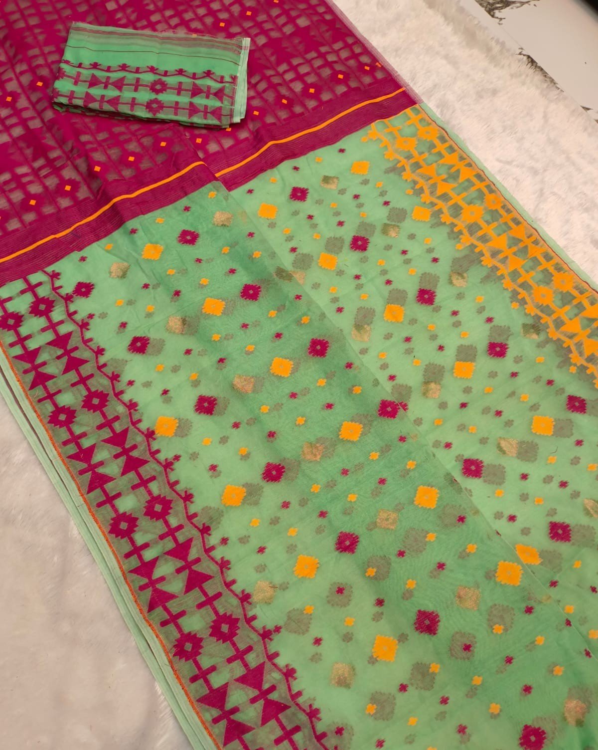 Faded Green Soft Ganga Jamuna Jamdani Sari With Blouse Piece
