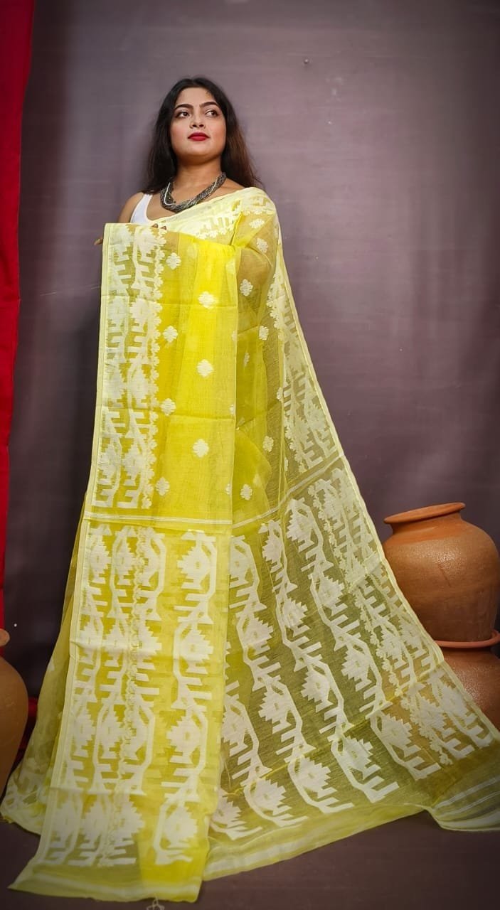 Fuel Yellow Body Masline Jamdani Saree