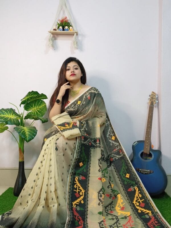 Exclusive Cream Black Ikkot Soft Jamdani Saree