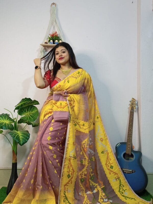 Exclusive Brown Yellow Ikkot Soft Jamdani Saree