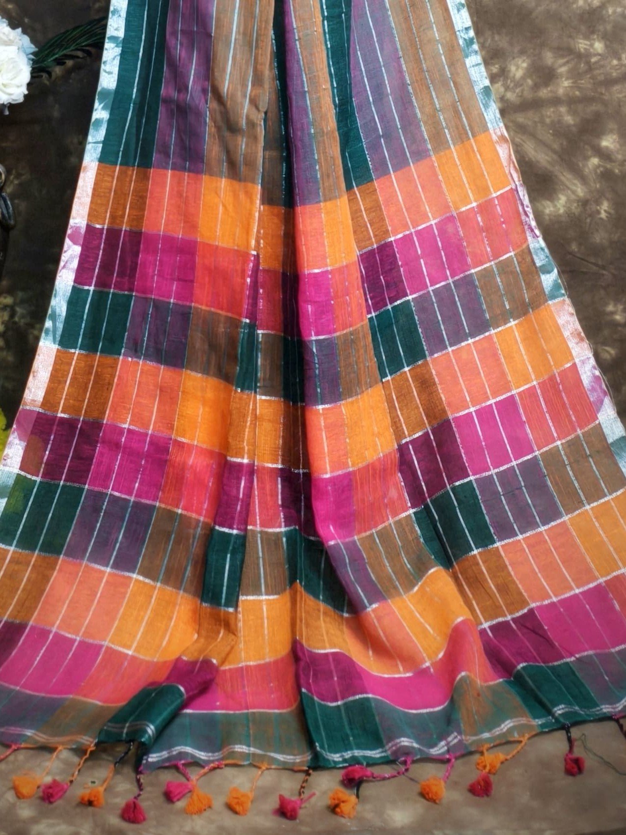 1. Dry Clean Only: To maintain the integrity of the delicate fabric and intricate handloom work, it is recommended to dry clean this saree. Professional dry-cleaning will help preserve the colors and textures over time.
