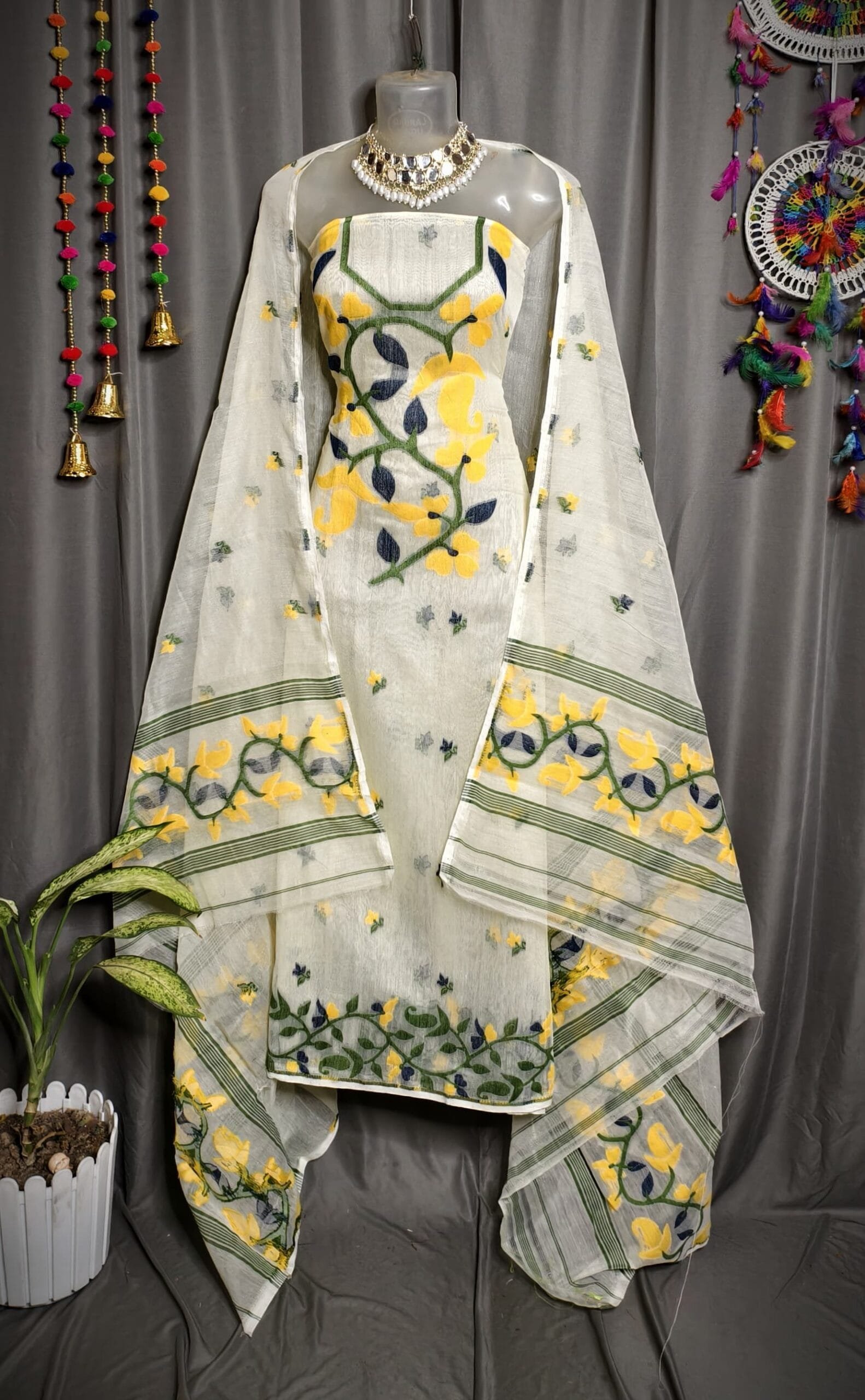Ikkat Cactus Muga Cotton Unstitched Jamdani Suit Set