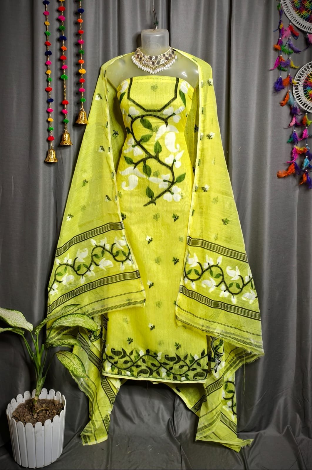 Lota Pata Lemon Yellow Muga Cotton Unstitched Jamdani Suit Set