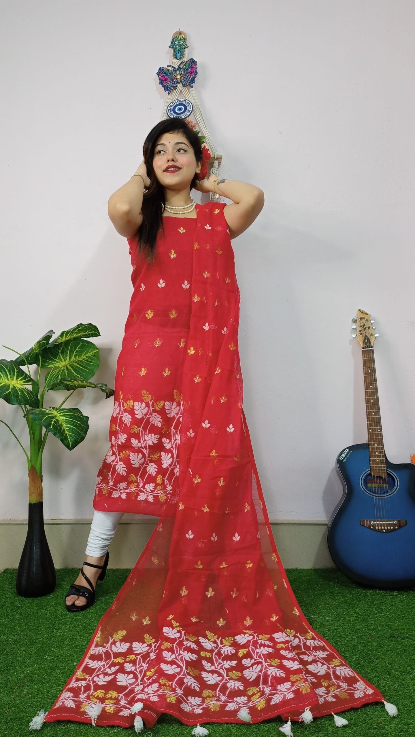 Lota Red Muga Cotton Unstitched Jamdani Kurta Set