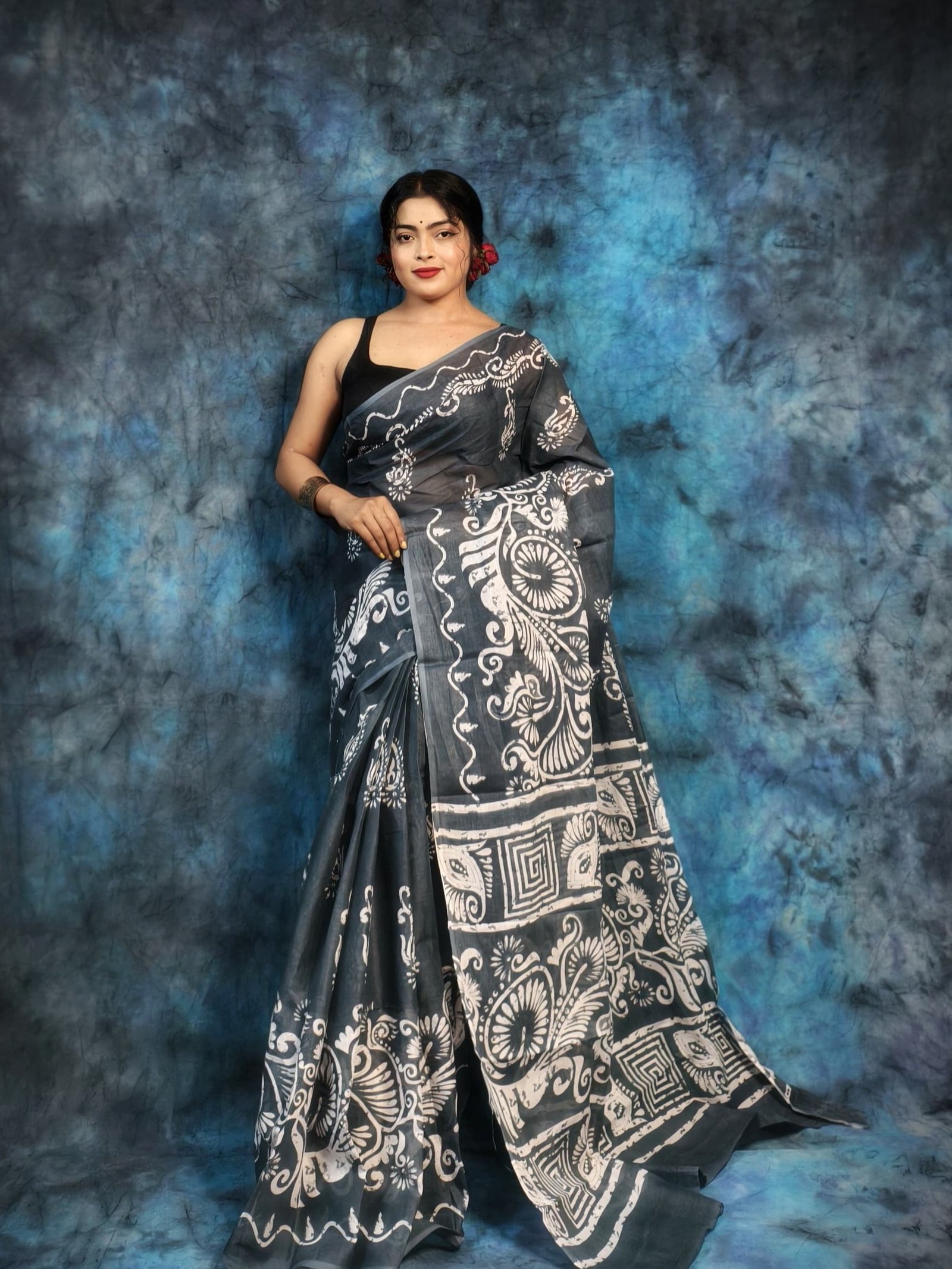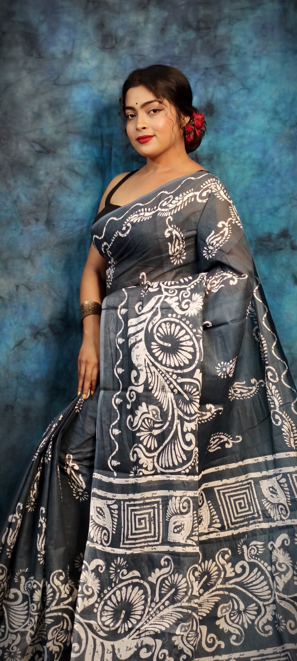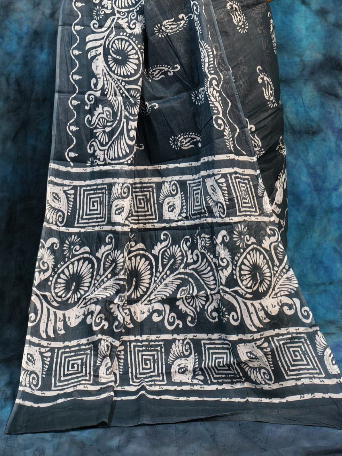 Dark Blue Grey Soft Mulmul Cotton Saree