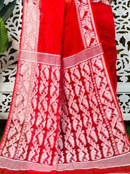 Red Soft Body Plain Jamdani Sari With Blouse Piece