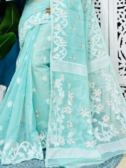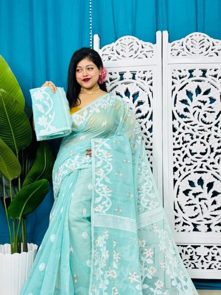 Blue Hosta Soft Bonolota Jamdani Sari Wiht Blouse Piece