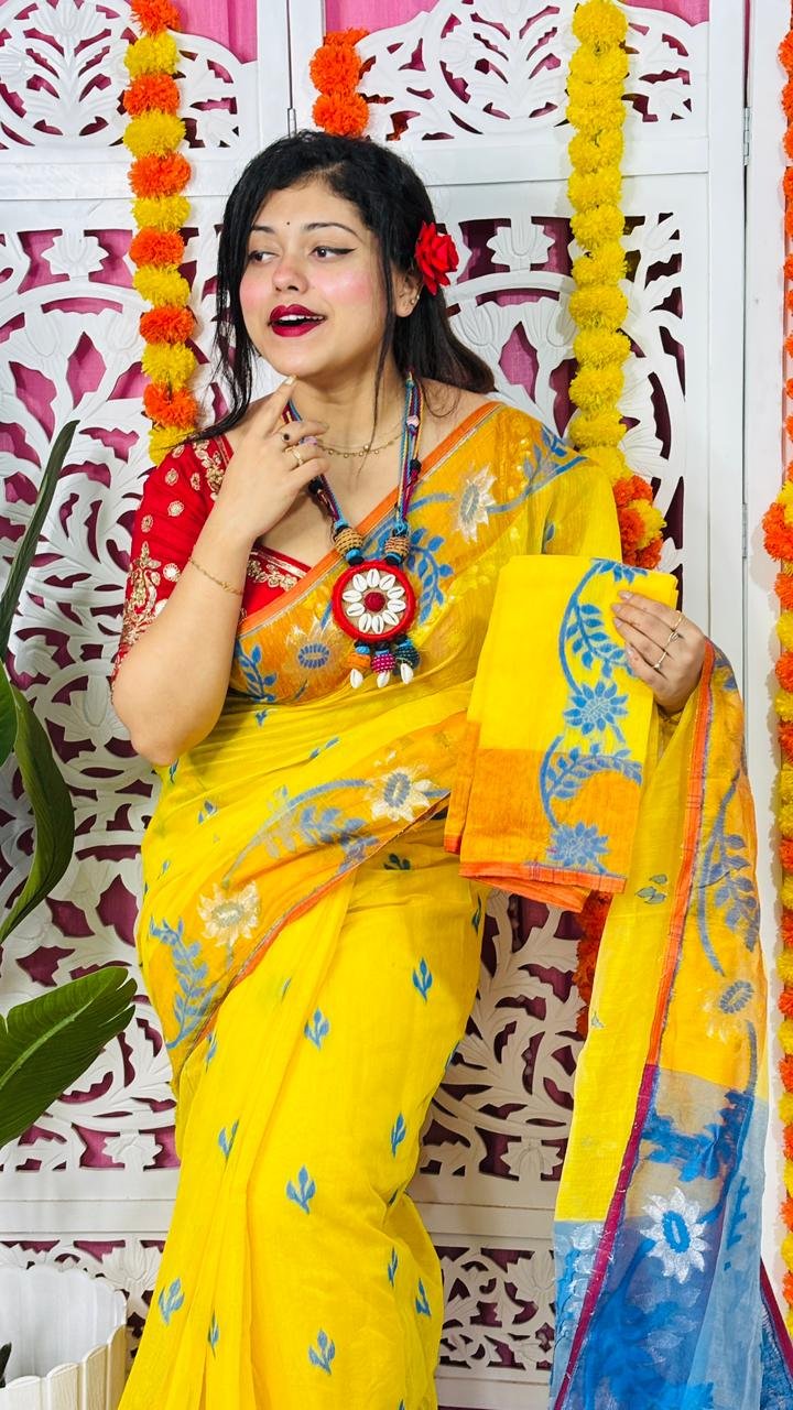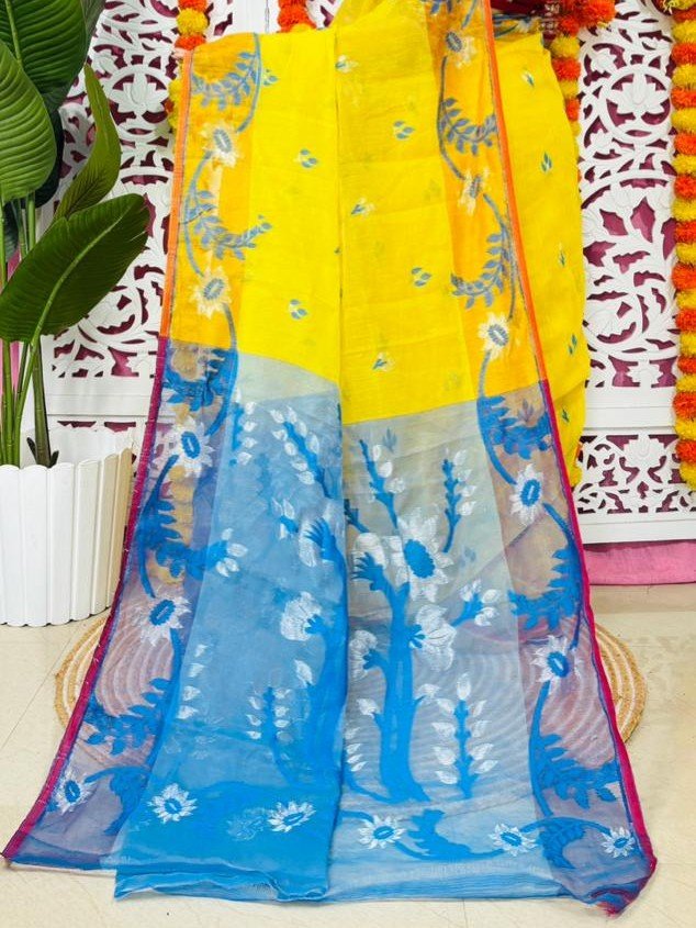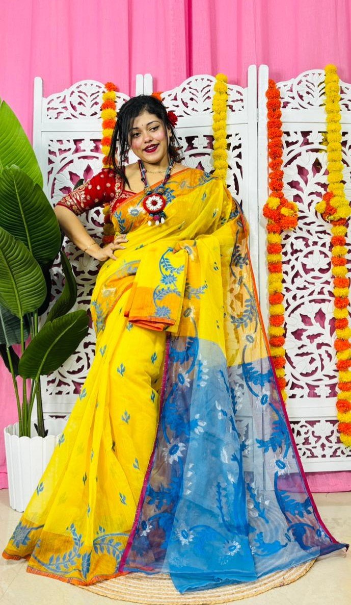 Yellow Soft Lota Pata Jamdani Sari With Blouse Piece