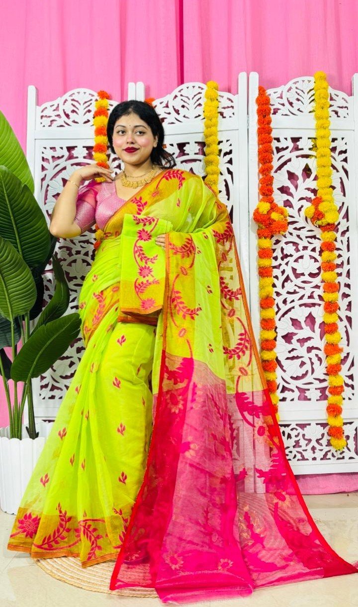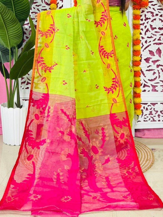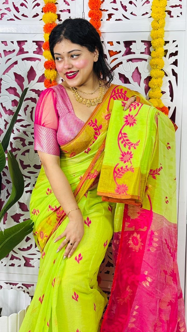 Yellowish Green Soft Lota Pata Jamdani Sari With Blouse Piece