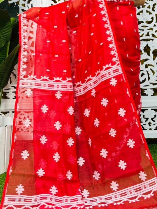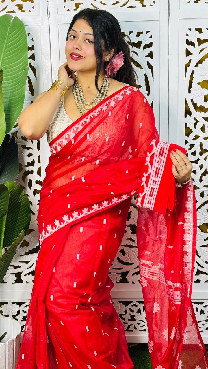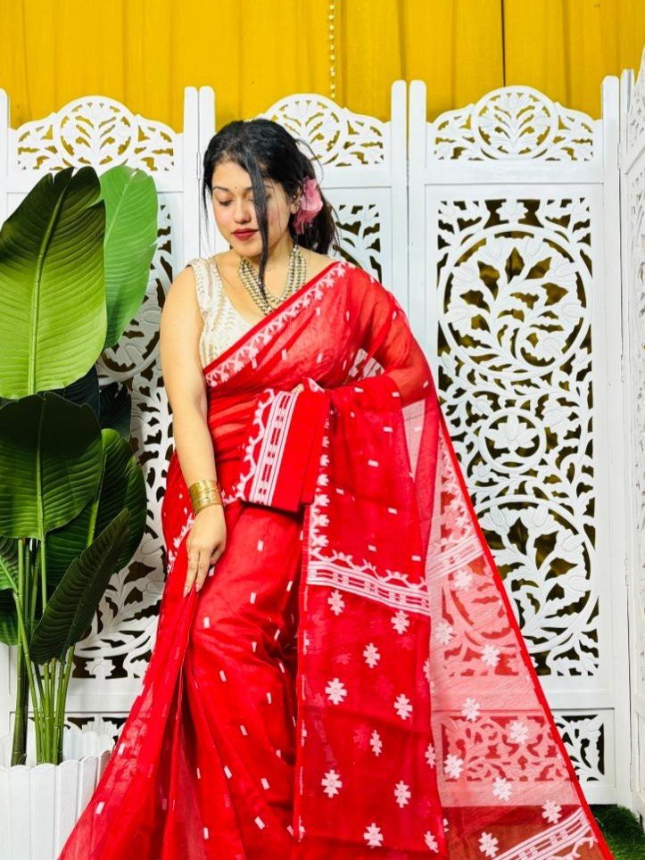Nayan Tara Red Soft Jamdani Saree With Blouse Piece