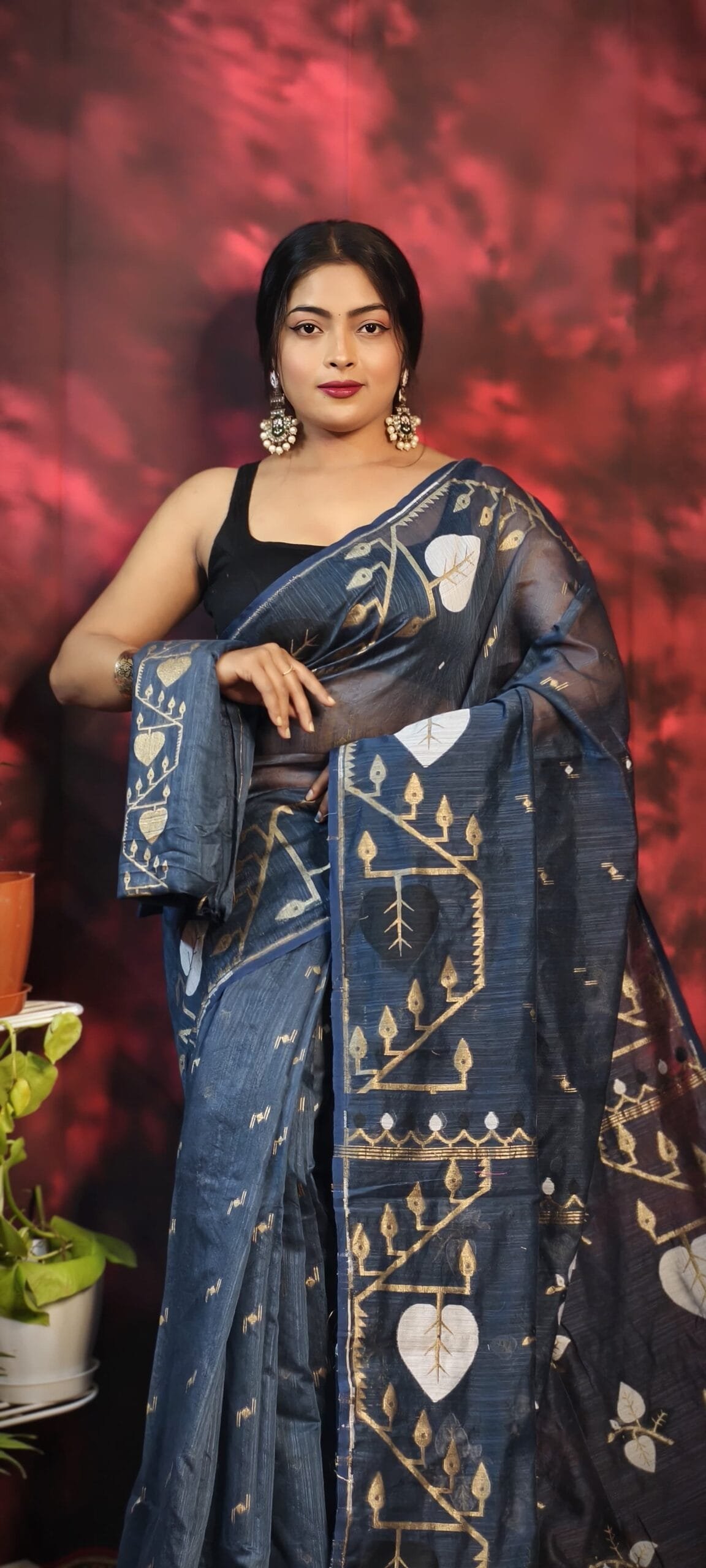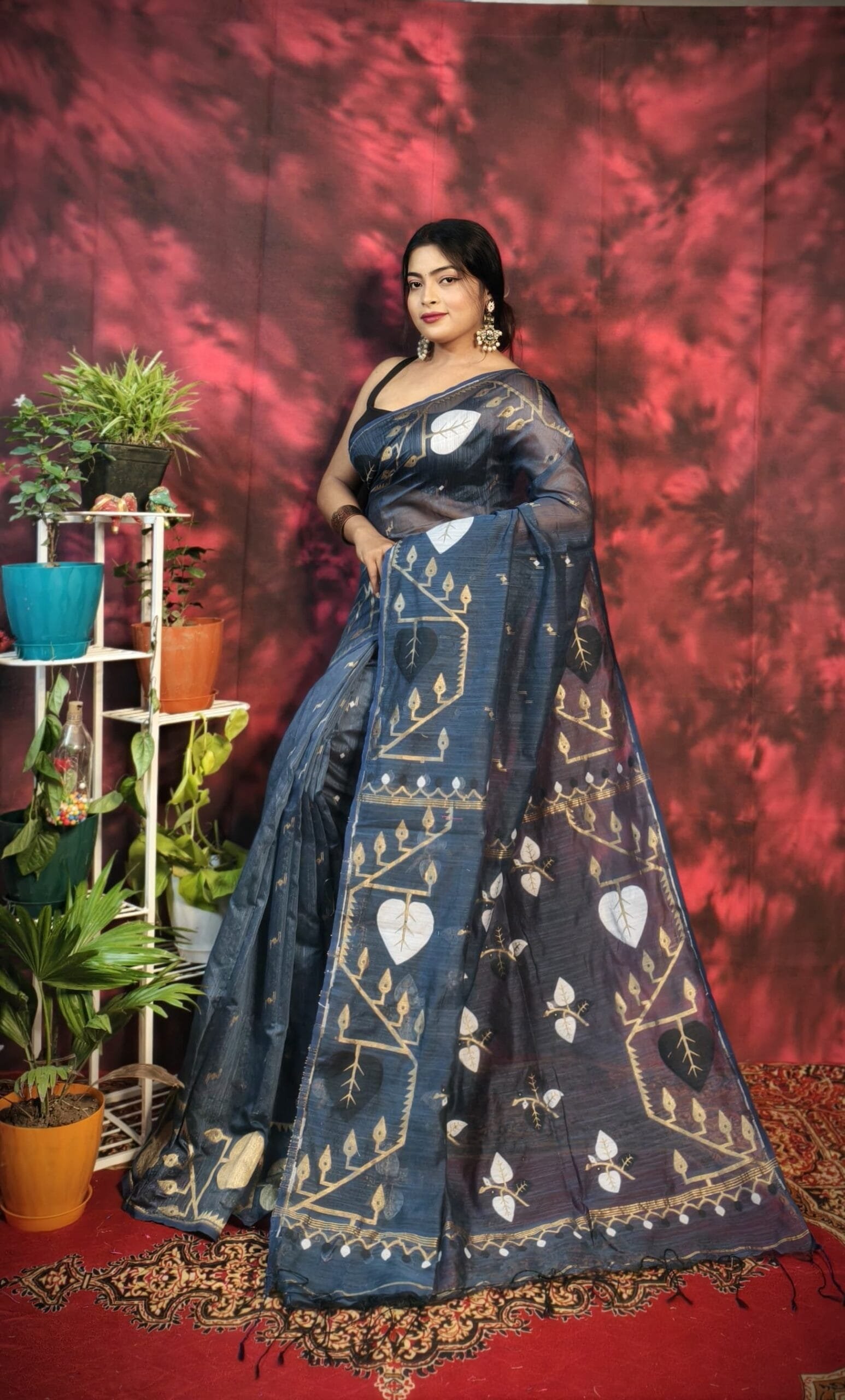 Pan Pata Soft Navy Blue Handloom Sare With Blouse Piece