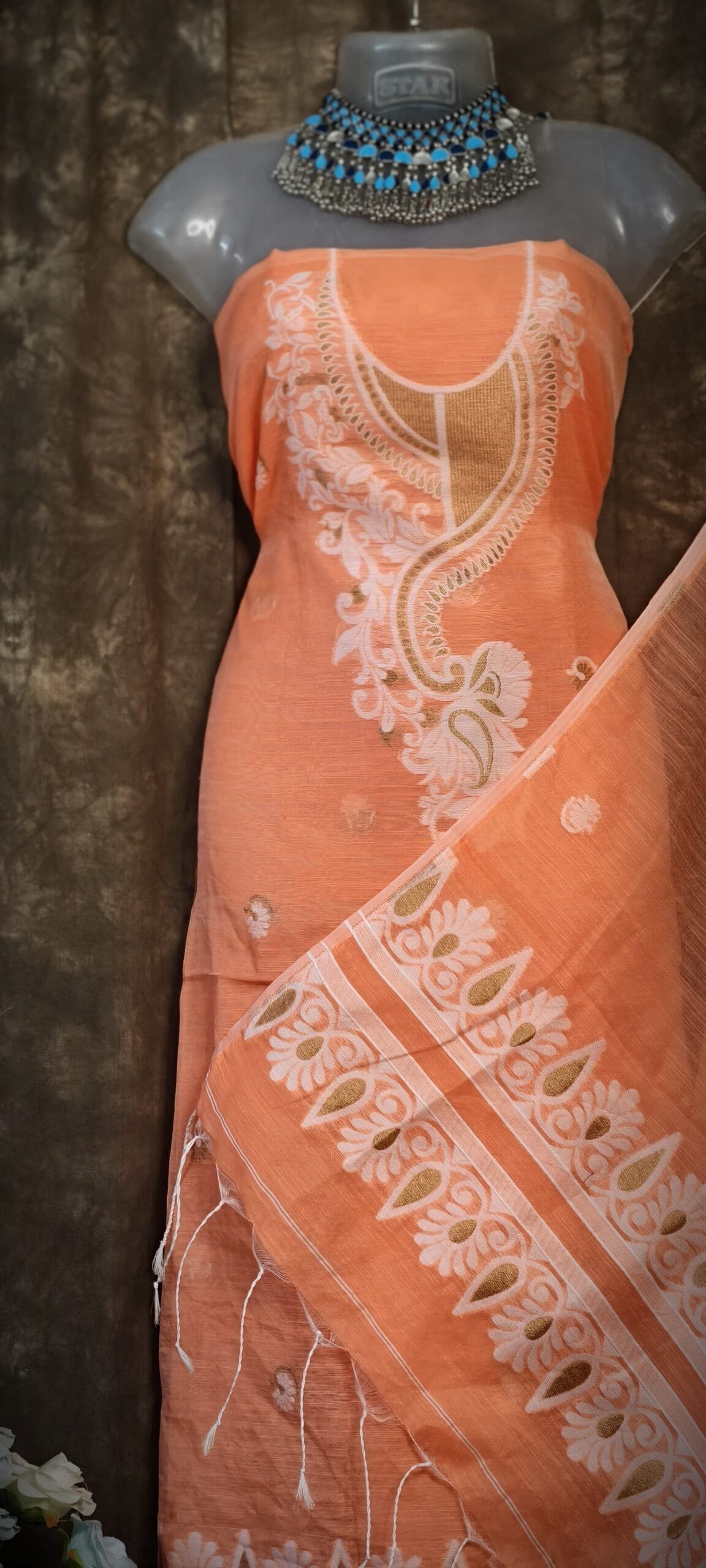 Kalka Orange Salmon Muga Cotton Unstitched Jamdani Suit Set