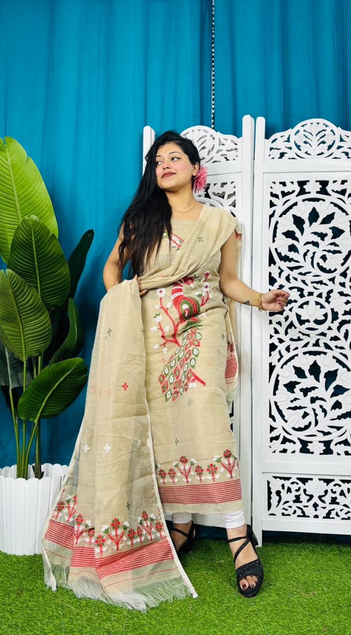 Unstitched Soft 2 Piece Jamdani Churidar - Cream