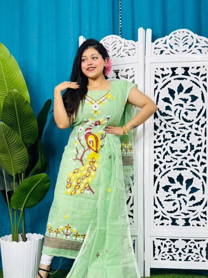 Unstitched Soft 2 Piece Jamdani Churidar - Light Olive