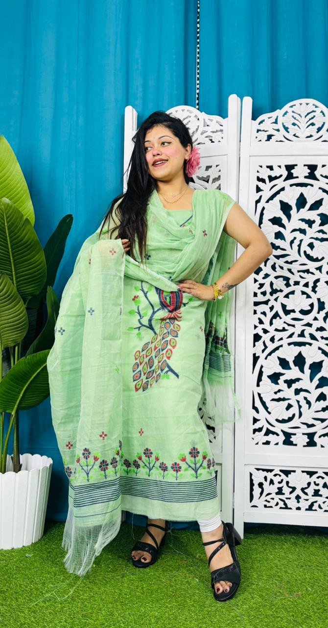 Unstitched Soft 2 Piece Jamdani Churidar – Light Olive